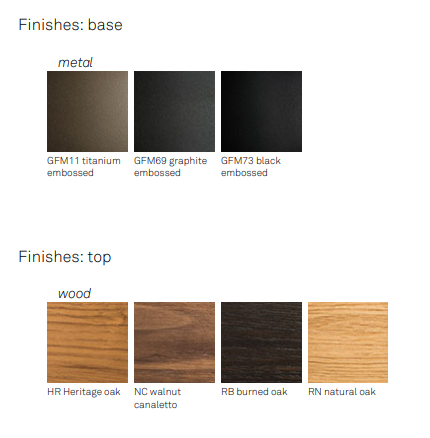 Table with titanium (GFM11), graphite (GFM69) or black (GFM73) embossed lacquered steel base. Feet in black chrome (06).