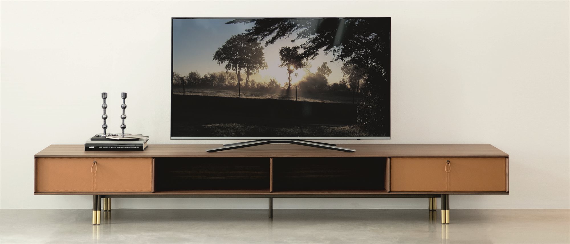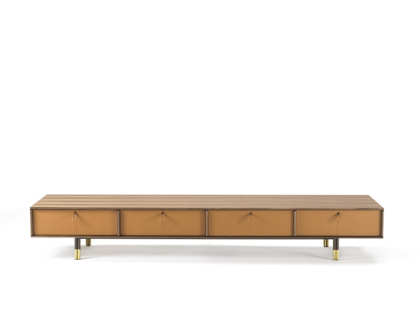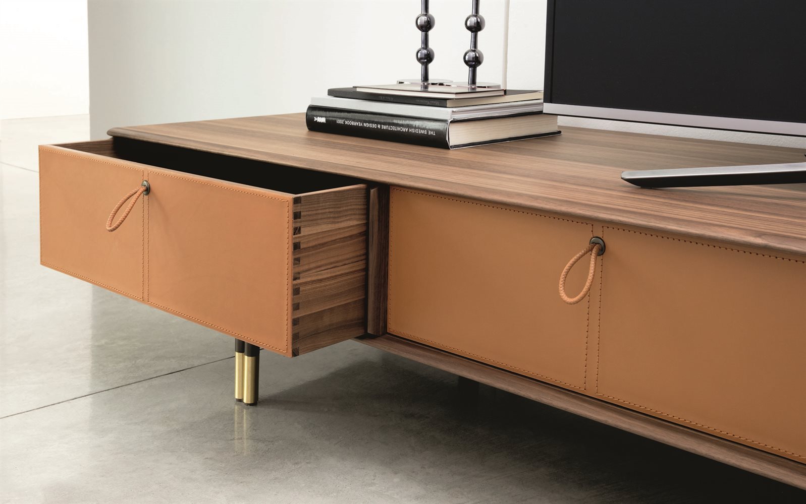 TV stand in canaletta walnut with four compartments (with the possibility to insert four BAYUS DRAWERS. Solid edges.
