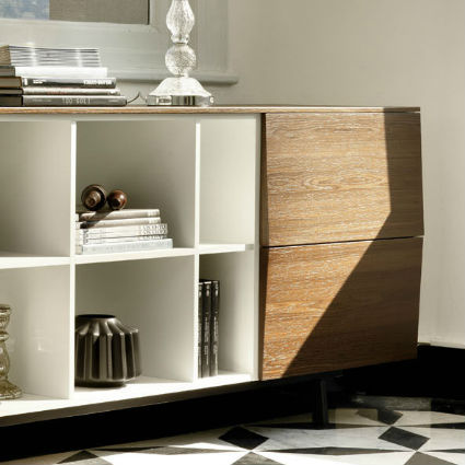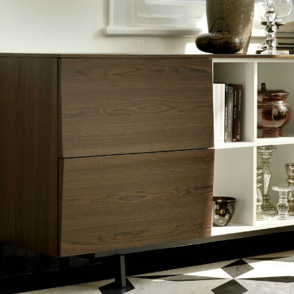 Contemporary large sideboard with two door with push-pull opening system and internal shelves in clear glass. Internal finishing and open shelf in white, sand, dark brown, yellow, red or blue and top, side and front panels in spessart oak, elm or matt lacquered white or sand. Available in a range of sizes and heights.