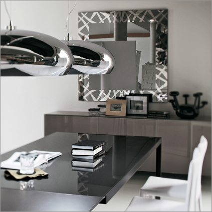 Contemporary wall mirror in mirrored or smoked grey glass with stainless steel applied frame.