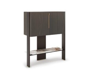 Sideboard with wooden frame in Canaletto walnut (NC) or burned oak (RB). Metal inserts in bronze (GFM18) embossed lacquered. Base inbronze (GFM18) embossed lacquered steel. Internal shelves in fumé glass. Optional: led light.