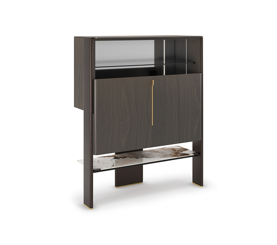 Sideboard with wooden frame in Canaletto walnut (NC) or burned oak (RB). Metal inserts in bronze (GFM18) embossed lacquered. Base inbronze (GFM18) embossed lacquered steel. Internal shelves in fumé glass. Optional: led light.