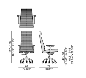 Executive swiveling armchair with five stars feet on castors, armrests in solid canaletta walnut and cover in the fabrics of the collection. It is possible to combine different fabrics for inside and outside. The fabric used for the front part of the seat and the back always has horizontal stitching