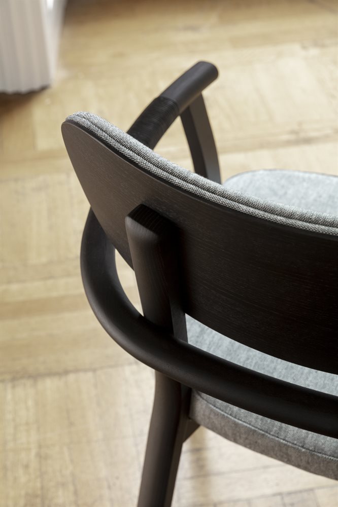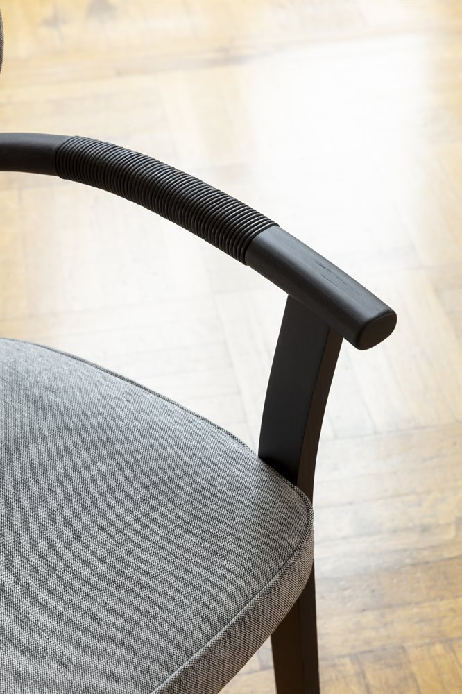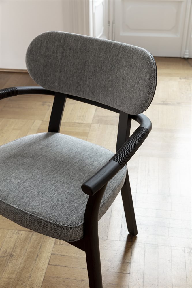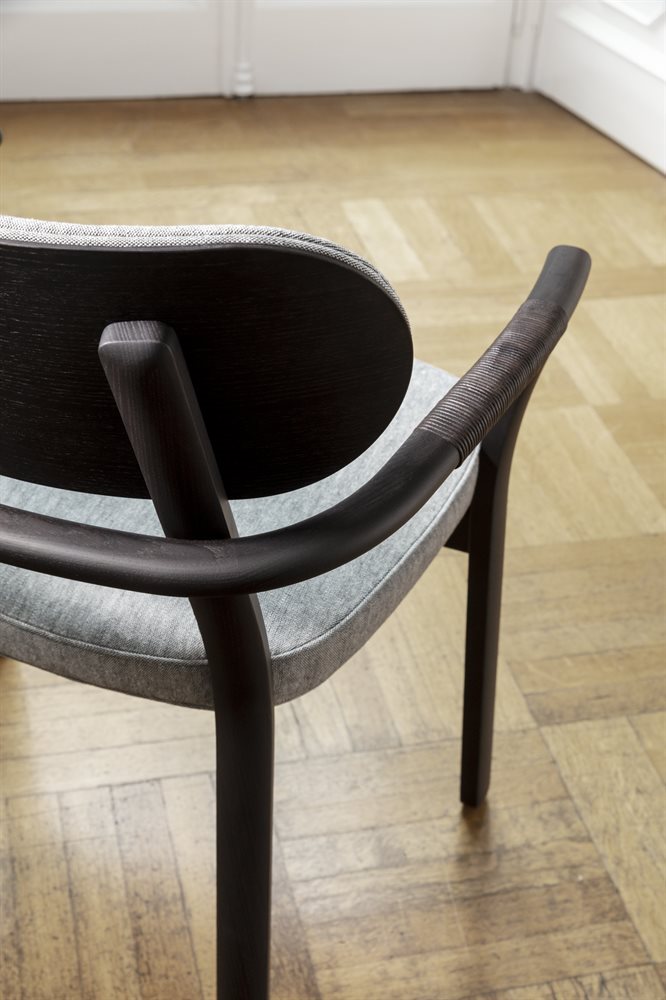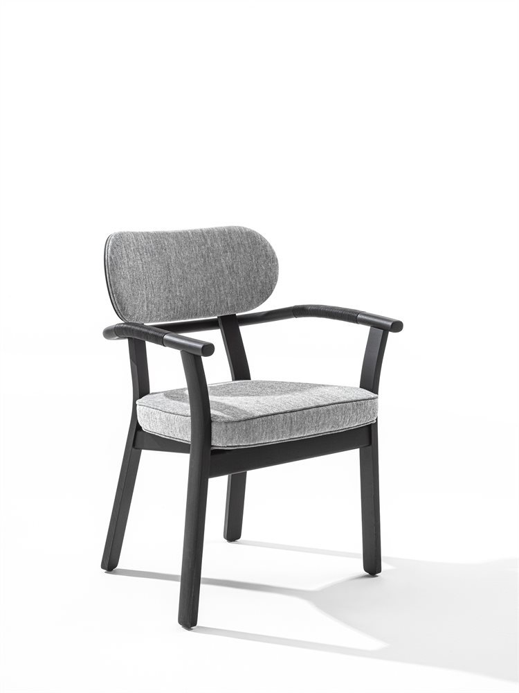 Chair with arms with frame in solid ash and cover in the fabrics of the collection. Armrests covered with waxed natural or testa di more Cuoio leather cord.