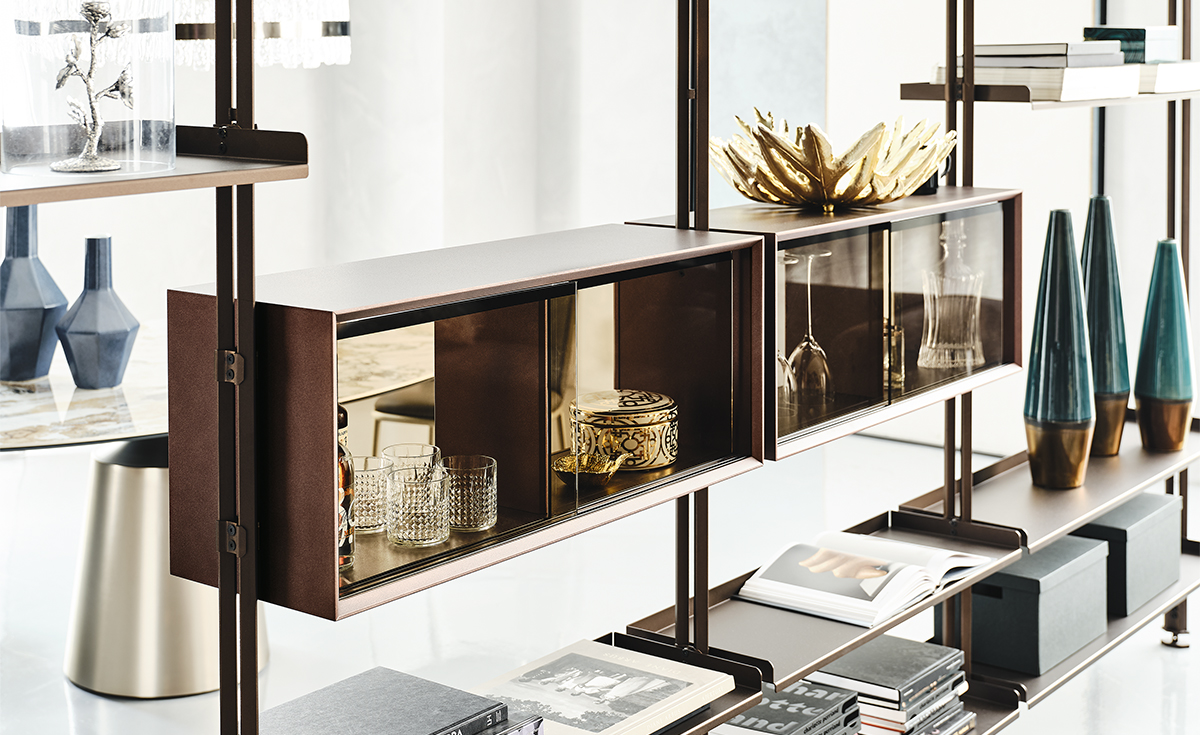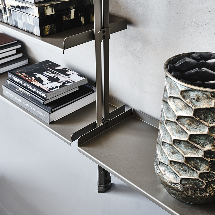 Modular wall- or ceiling-hanging bookcase. Brackets, pillars and shelves in titanium (GFM11) or bronze (GFM18) embossed lacquered steel. Containers in titanium (GF11) or bronze (GF18) embossed lacquered wood and fumé glass.