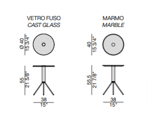 Round side table with metal base and central pole in solid canaletta walnut. Top in cast glass (thickness 15 mm) or in marble with metal plate.