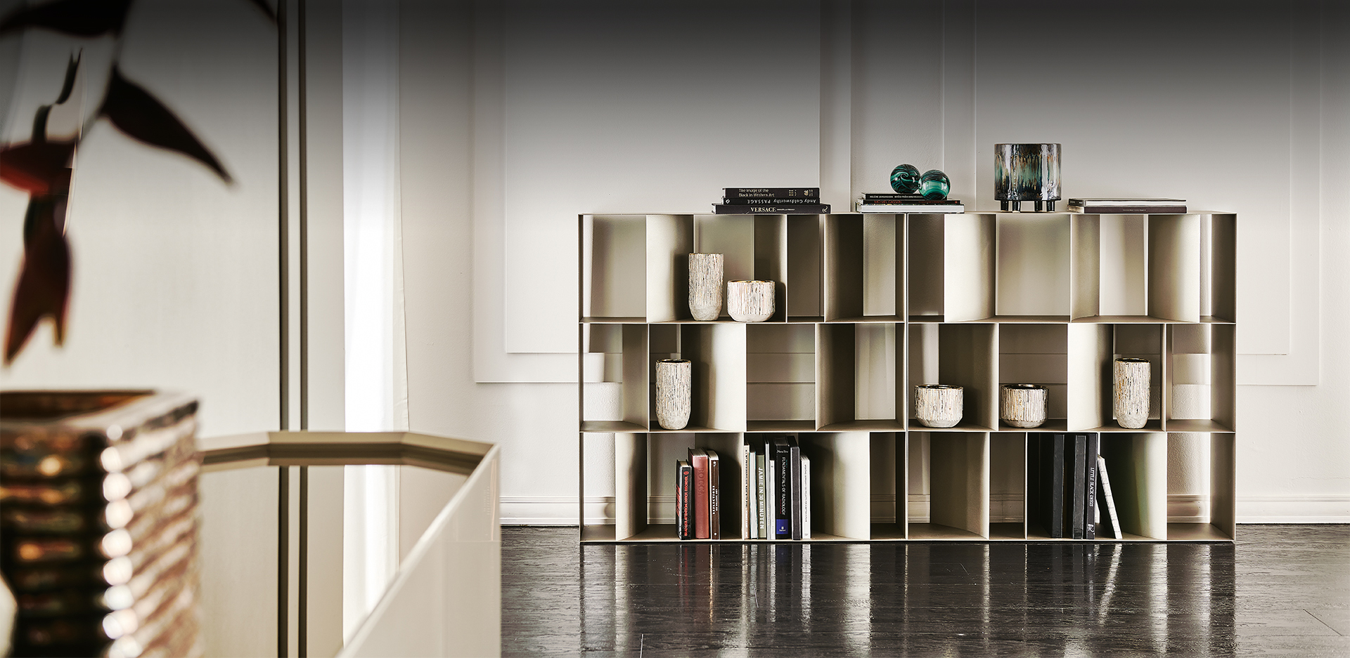 This modular bookcase‘s evocative name reminds us of fantastic journeys and legendary adventures. Just like the books it showcases, along with the memorabilia gathered from around the world. The Nautilus modern bookcase, designed by Studio Brogliato Traverso, is a composition of modular units that can be set up side by side or stackable, horizontally or vertically. When placed in the center of the room, it is a refined room divider metal bookcase. A descreet light passes throught its vertical elements, inclined like the sails of a boat on a windy day at sea. The exquisite metallic finish gives a bright appearance to the room and decorates the walls with fine discretion, allowing the bookcase to perfectly integrate with an elegant and modern living room.