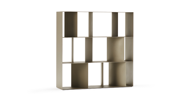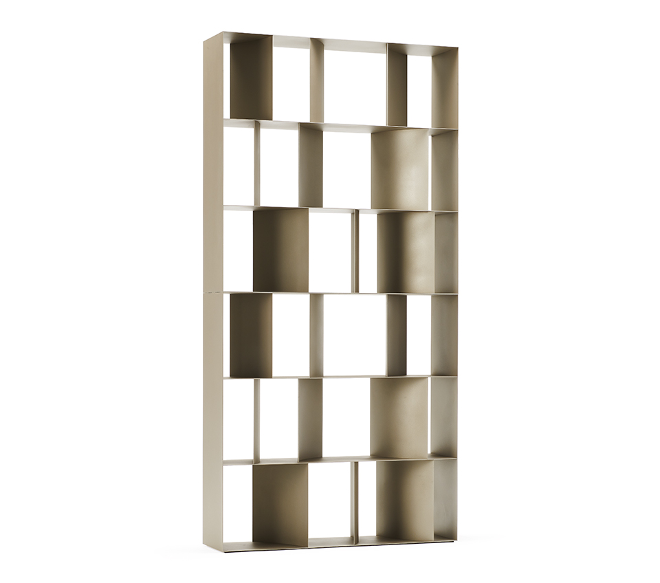 Bookcase in titanium (GFM11), bronze (GFM18), graphite (GFM69) or black (GFM73) embossed lacquered steel, each unit can be set up side by side or stackable. Wall anchorage is necessary if the optional ballast is not fixed.