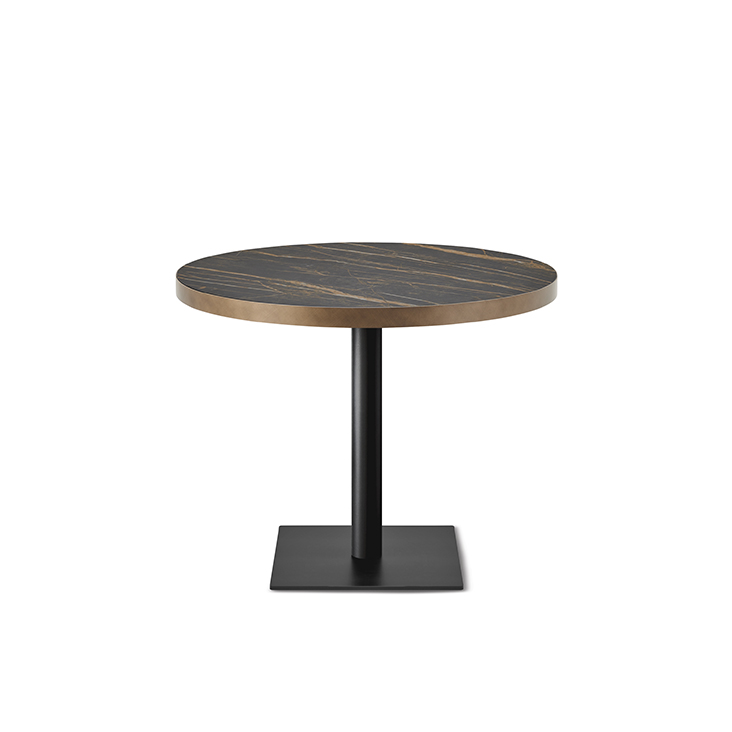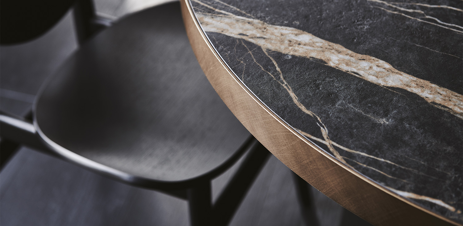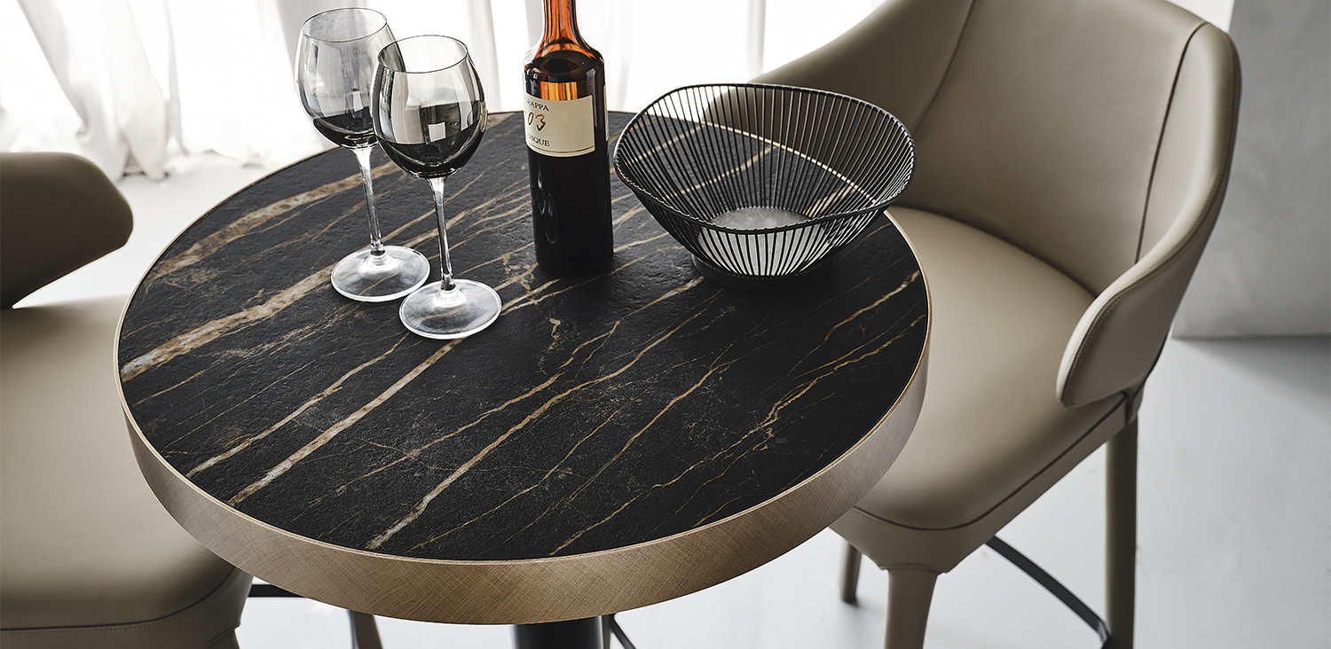 Bistrot table with base in titanium (GFM11), graphite (GFM69) or black (GFM73) embossed lacquered steel and top frame in titanium (GFM11), graphite (GFM69) or black (GFM73) embossed lacquered steel or Brushed Bronze. Marmi Alabastro (KM02), Ardesia (KM04), matt Portoro (KM07), glossy Portoro (KM08), Emperador (KM10), Makalu (KM11) or Arenal (KM13) ceramic top.