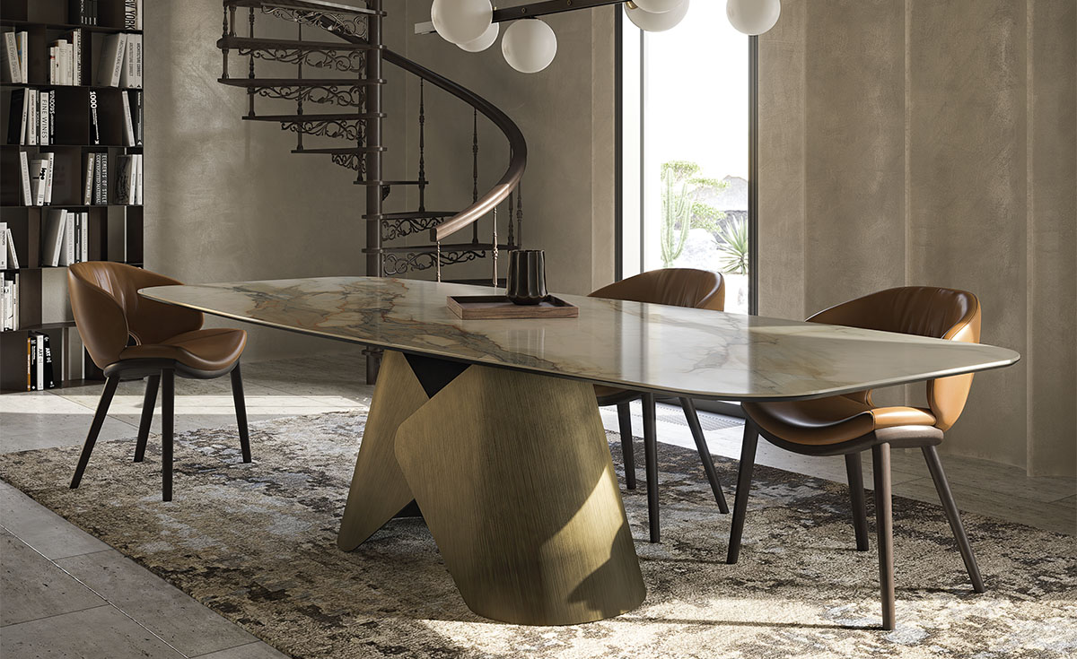 Table with embossed lacquered titanium (GFM11), bronze (GFM18) or Oxybrass steel base. Top in ceramic Marmi Alabastro (KM02), Supreme(KM03), matt Golden Calacatta (KM05), glossy Golden Calacatta (KM06), matt Portoro (KM07), glossy Portoro (KM08), glossy Sahara Noir(KM09), Makalu (KM11), Breccia (KM12), Arenal (KM13), Corcovado (KM14), Kaindy (KM16), matt Borghini Calacatta (KM18) or glossy BorghiniCalacatta (KM19).