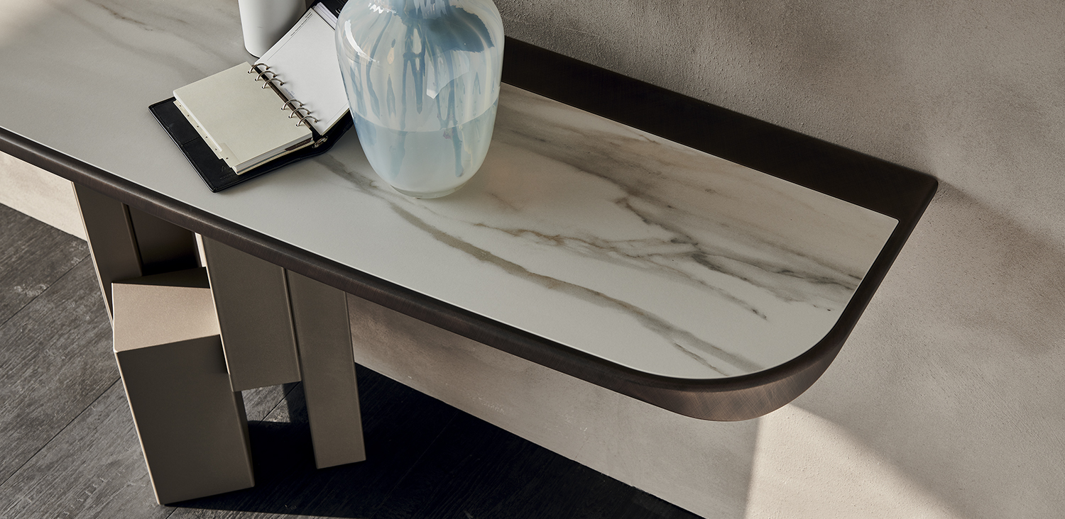 Console with base in titanium (GFM11), graphite (GFM69) or black (GFM73) embossed lacquered steel. Top in ceramic Marmi Alabastro (KM02), Supreme (KM03), Ardesia (KM04), matt Golden Calacatta (KM05), glossy Golden Calacatta (KM06), matt Portoro (KM07), glossy Portoro (KM08), glossy Sahara Noir (KM09), Emperador (KM10), Makalu (KM11), Breccia (KM12), Arenal (KM13) or Zefiro (KZ20) with Brushed Bronze or Brushed Grey lacquered and rounded lower profile. Wall anchorage is necessary. Top thickness is 5cm.
