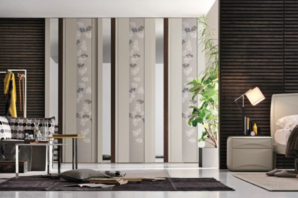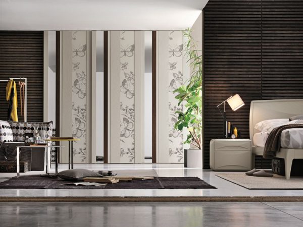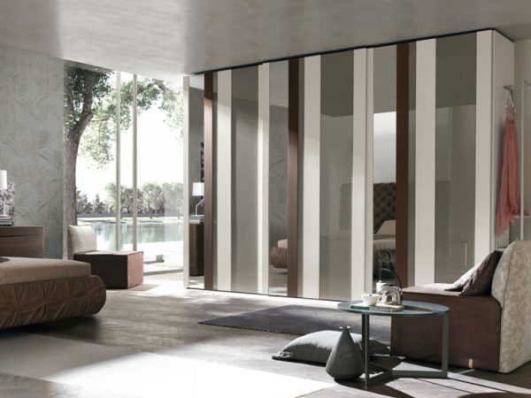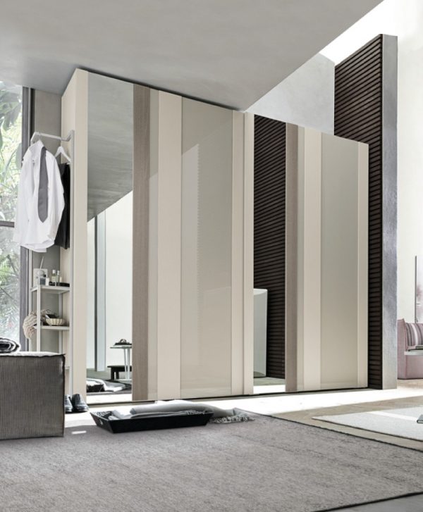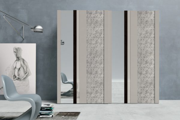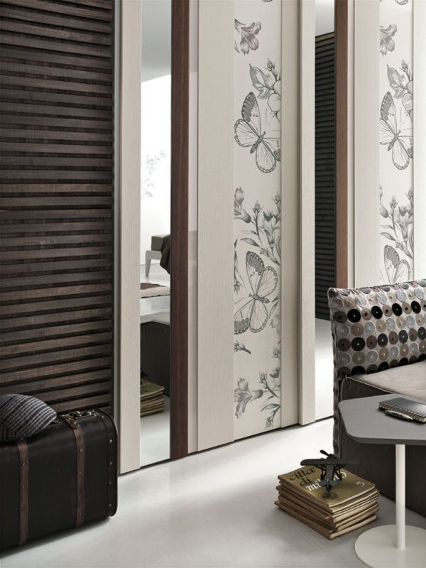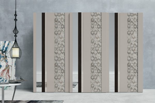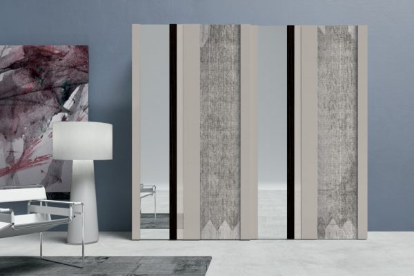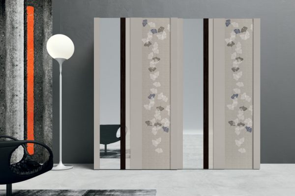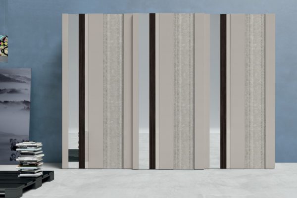 Strike is not only a wardrobe but also a decorative element. Colour, reflections and grain patterns: with an interplay of overlapping materials to mix as desired and create customised combinations, the Strike sliding door wardrobe is able to satisfy different lifestyles. The Strike sliding door is also available with a choice of decorations: Square, Farfalle, Blow, Soffioni, Round and Trees.