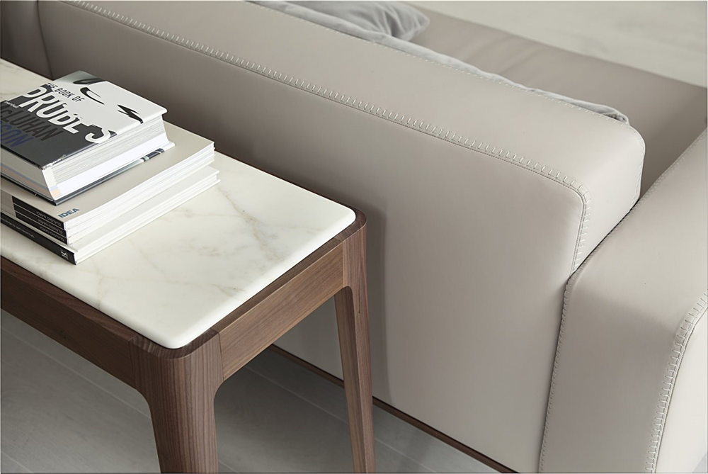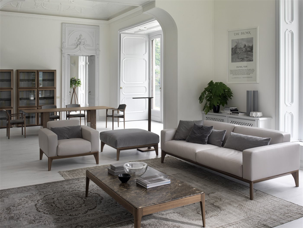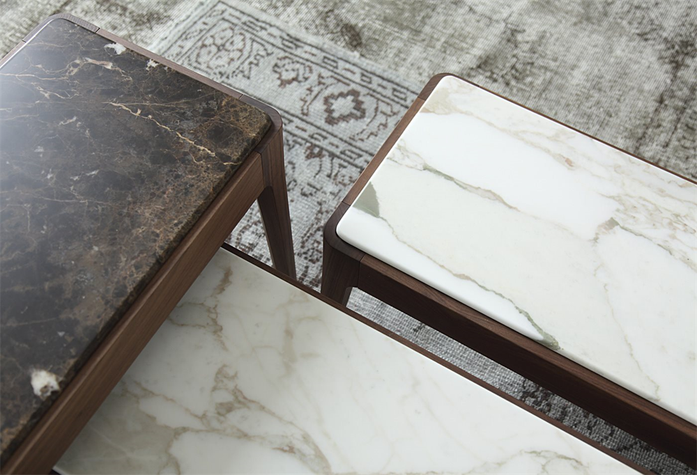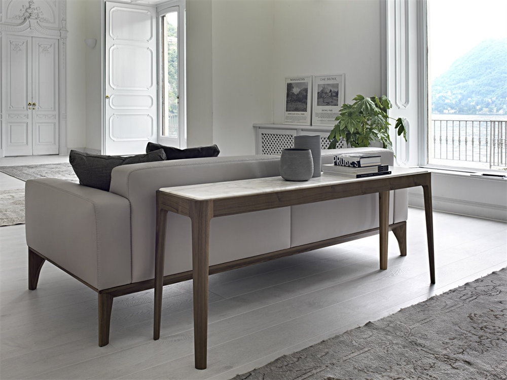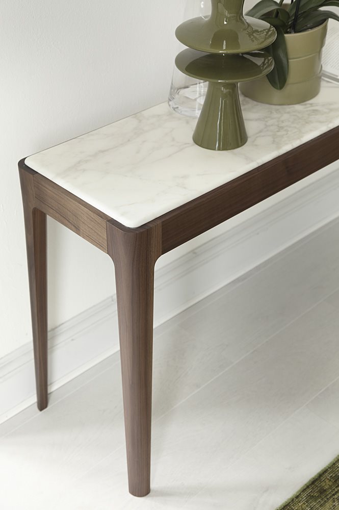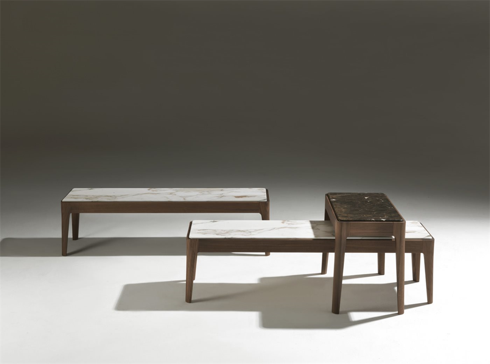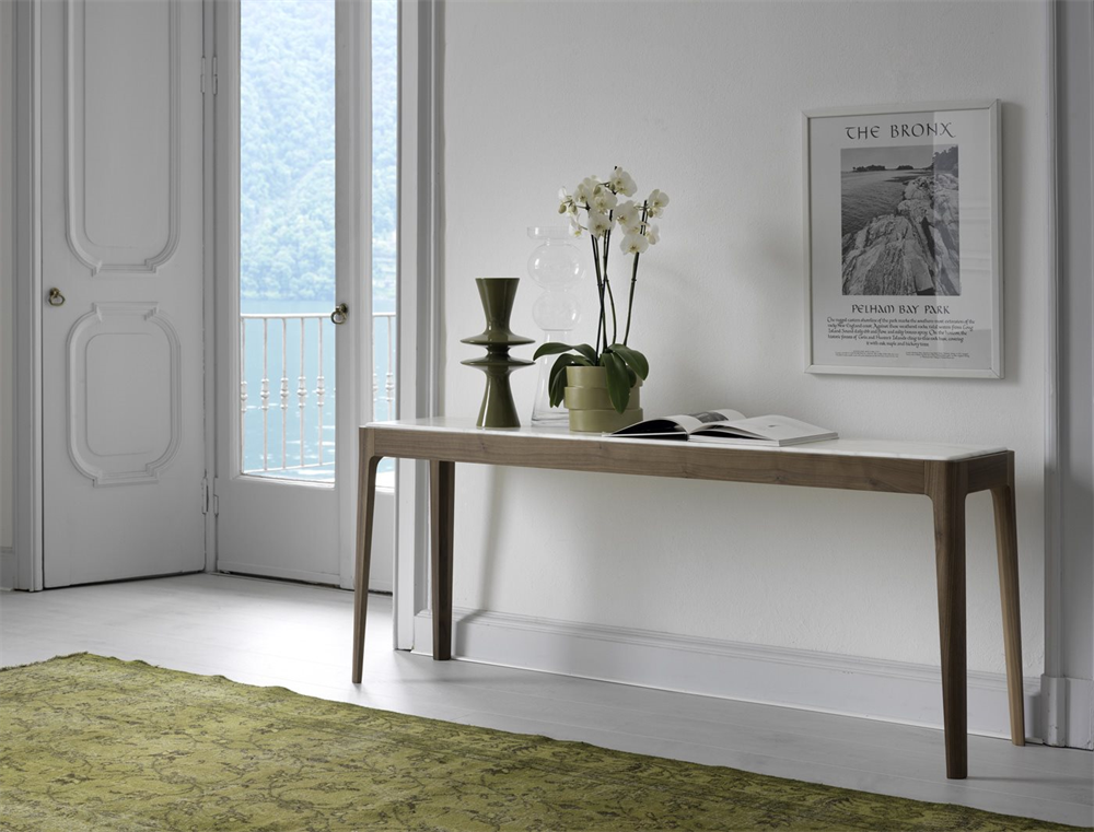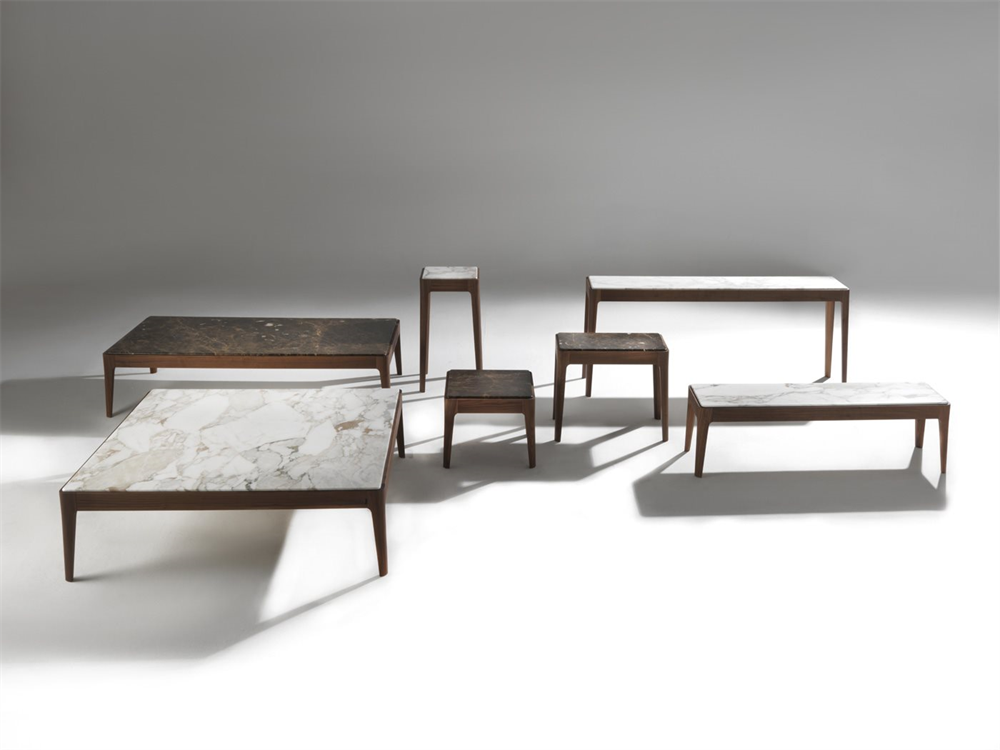 Rectangular dining table with frame in solid canaletta walnut or ash and top in marble, wood or frosted glass backcoated.