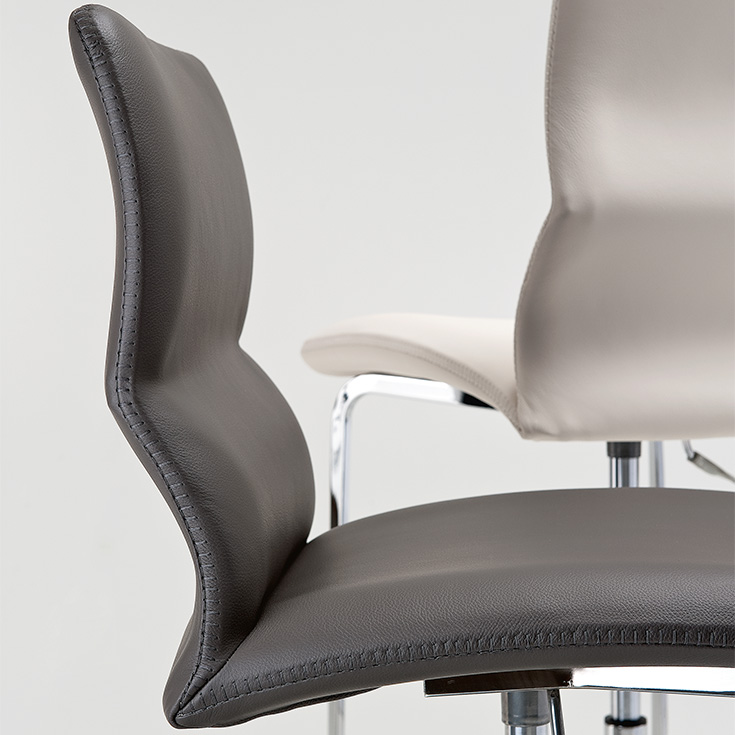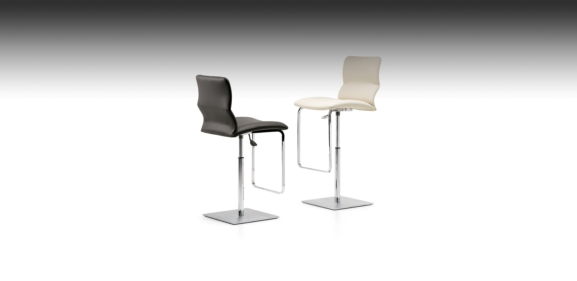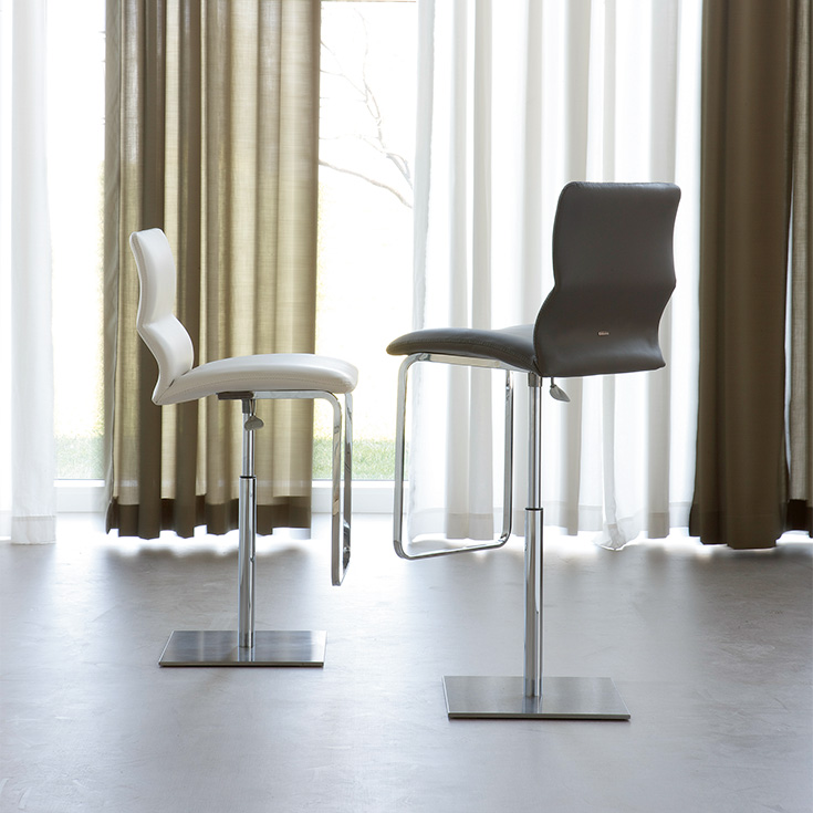 The modern stools in the Victor family are the expression of a comfortable and enveloping design. With soft folds on the backrest and a curved shell in two overlapping horizontal bands, these bar stools are particularly suitable for elegantly furnishing kitchens with a designer peninsula. Victor and Victor X have different shaped bases, but both are swivel stools , with adjustable height, footrest and comfortable backrest. The second is lighter and easier to handle, perfect for contract interior design projects.